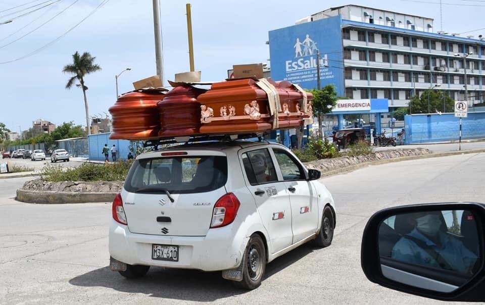 Un auto lleva en su techo a tres ataúdes, justo frente al hospital Almanzor Aguinaga. (Fotos Luis Rodríguez Sánchez).