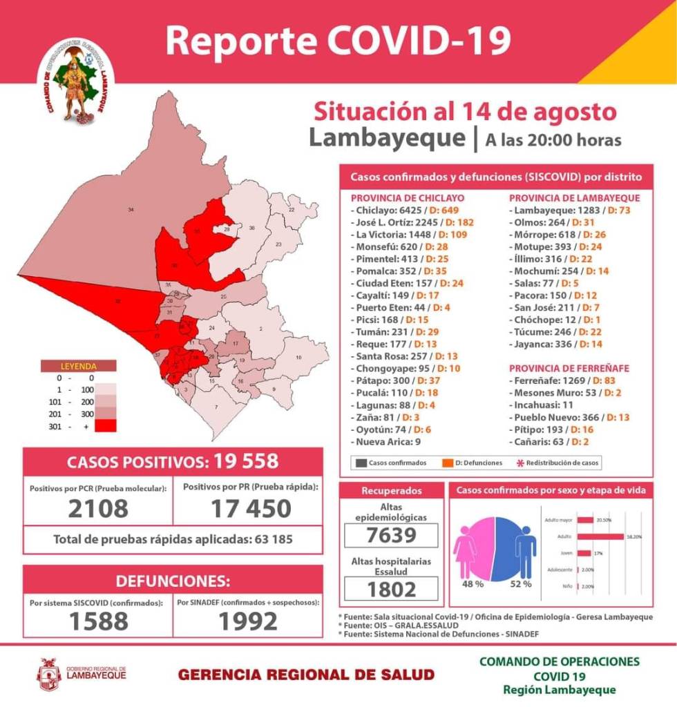 De ser así, está en los lambayecanos tomar todas las previsiones del caso para cuidar su salud porque el número en todos los distritos está aumentando. Y es que, tanto las cifras de los fallecidos, como de los contagiados, están registradas en el último cuadro ofrecido por la Gerencia de Salud a las 8:00 de la noche de este viernes, en el que aparecen los números de 1,588 muertos y 19,558 contagiados.