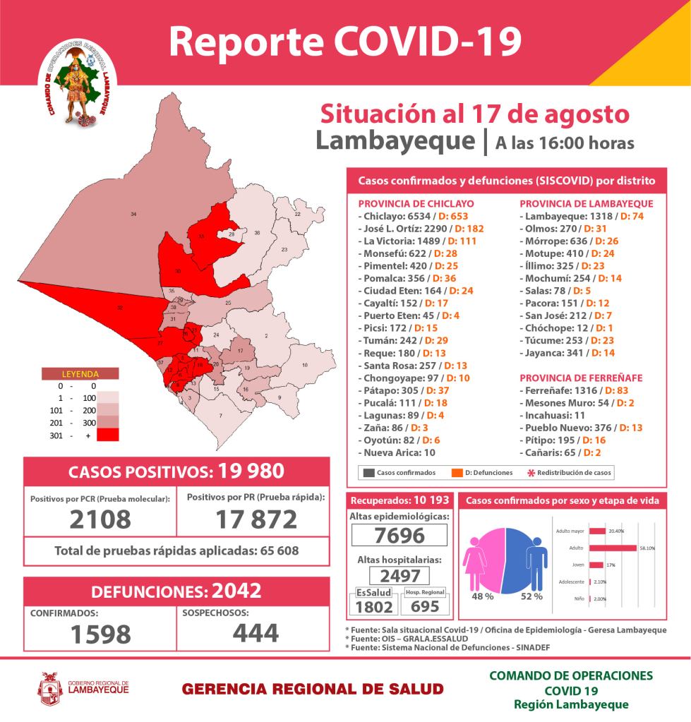 Asimismo, en las últimas 24 horas se registraron 96 contagiados, haciendo un total de 19,980 casos positivos en Lambayeque.