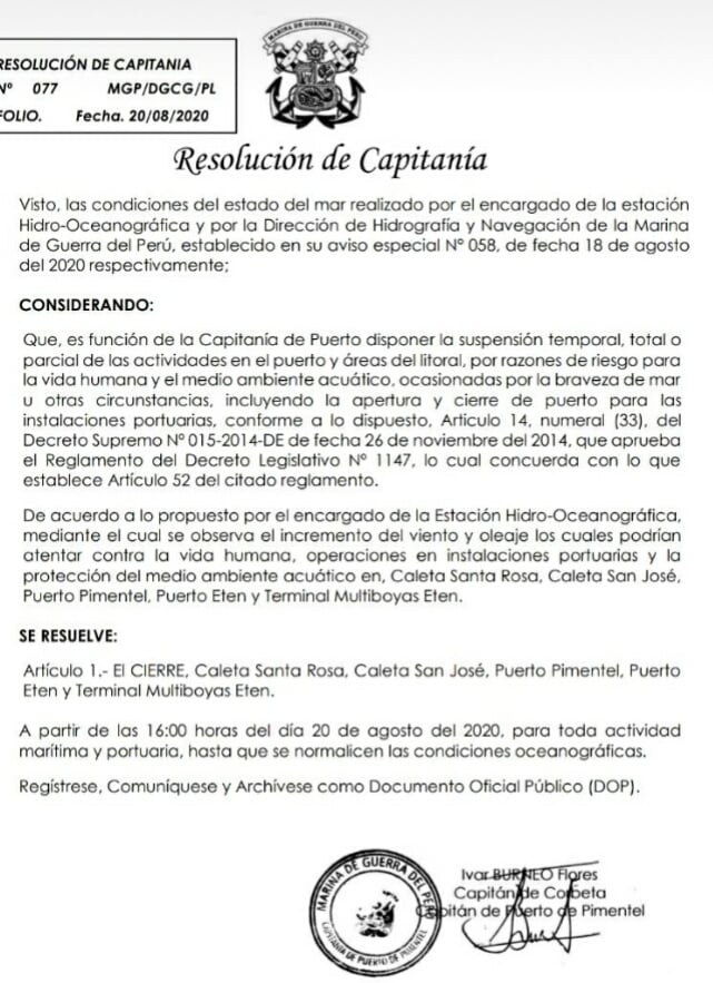 La Capitanía de Puerto dispuso el cierre de los puertos y caletas de Lambayeque, dado el fuerte viento y la braveza delmar. Según la Capitanía, la medida se adoptó de acuerdo a lo propuesto por el encargado de la Estación Hidro-Oceanográfica y por la Dirección de Hidrografía y Navegación de la Marina de Guerra del Perú, mediante el cual se observa el incremento del viento y oleaje, que podían atentar contra la vida humana, operaciones en instalaciones portuarias y la protección del medio ambiente acuático.