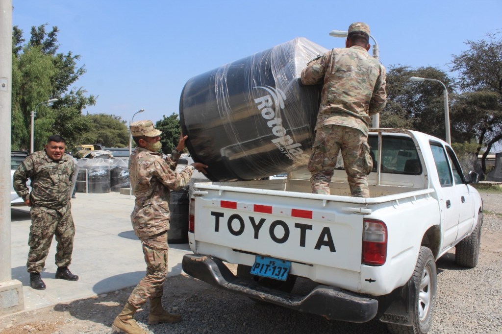 En el caso del Ejército se les hizo entrega de 4 tanques para el almacenamiento de agua que se emplea en el cuartel «Fuerte Cáceres» del distrito de Pimentel, y a fin de intensificar los protocolos de bioseguridad con el personal de tropa, según oficio n. ° 250/CIA DESACT EXPLS N.°11, dirigido al gobernador regional.