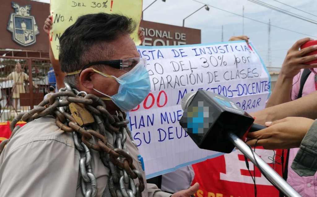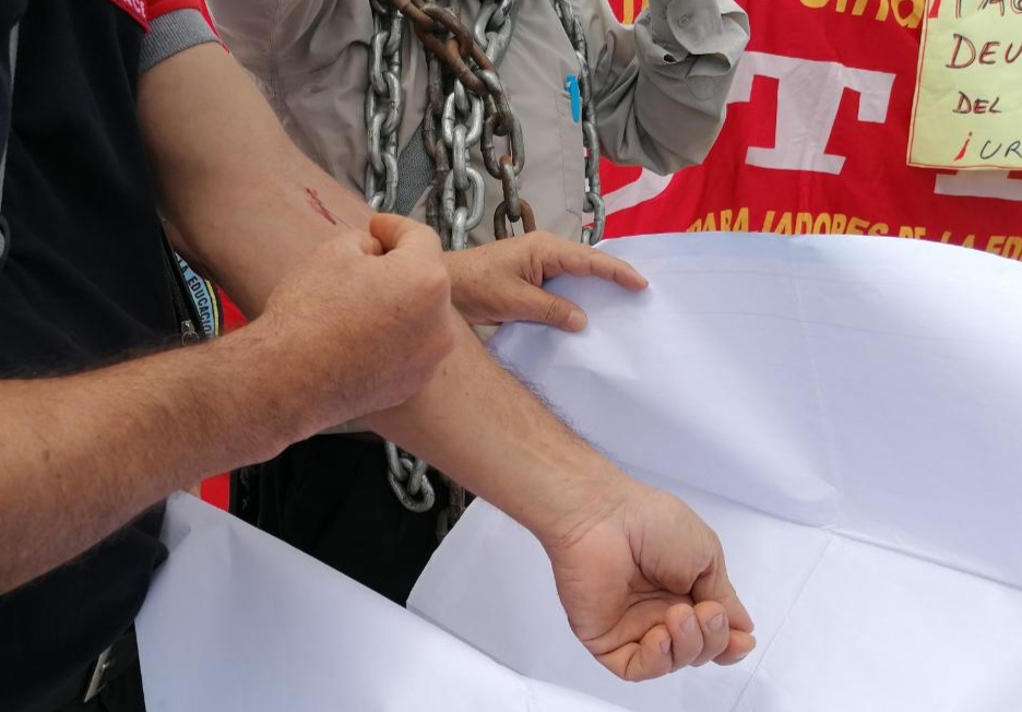 Docentes del Sindicato Unitario de trabajadores en la Educación-Sutep, se desangraron y encadenaron hoy, reclamando beneficios sociales que se les adeuda.