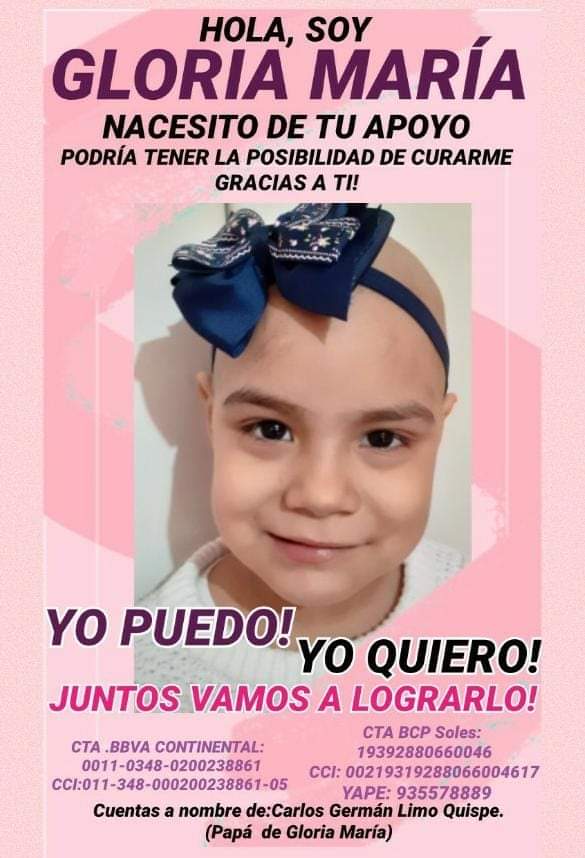 ¡Necesitamos de tu apoyo! Es el pedido que hacen los familiares de la niña chiclayana Gloria María Limo Vásquez, quien sufre de cáncer y constantemente viene luchando por su vida. «Estamos iniciando una campaña de recaudación de fondos para llevar a nuestra hija al mejor lugar posible fuera del país, en busca de la cura a tan terrible enfermedad en la que lleva luchando más de 2 años».