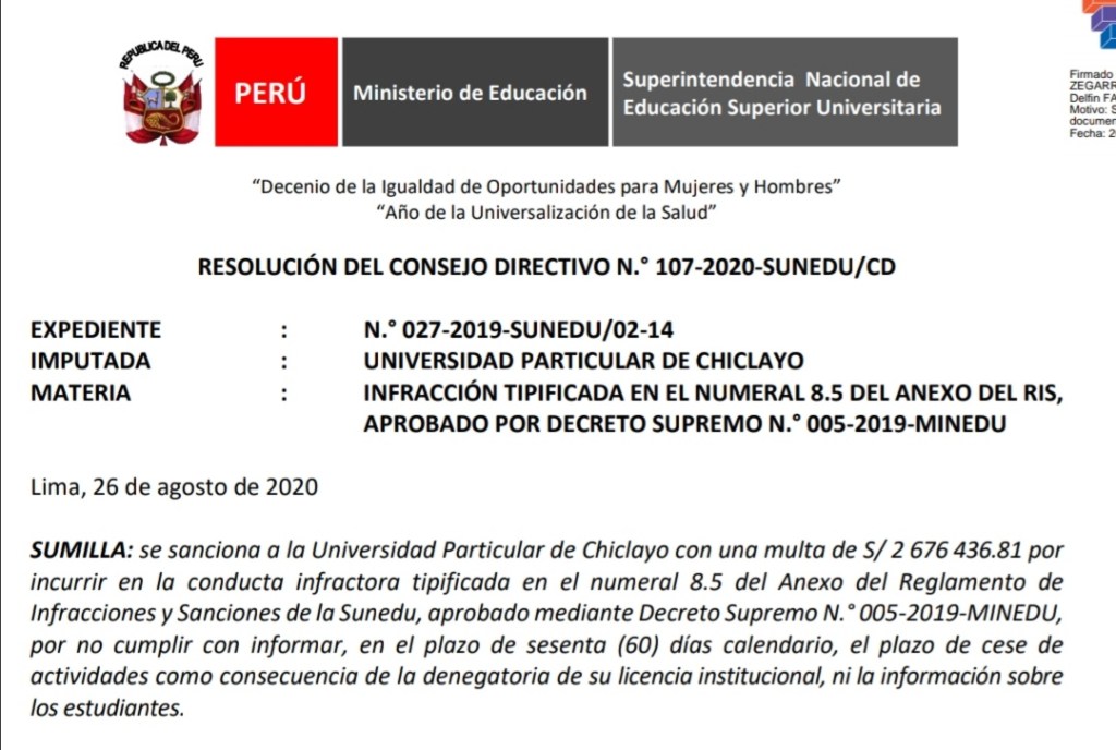 La Superintendencia nacional de educación superior universitaria-Sunedu, sancionó a la Universidad de Chiclayo-UDCH al pago de más de 2 millones 600 mil soles, «por incurrir en conducta infractora», ante lo dispuesto por la Sunedu y el Ministerio de Educación.