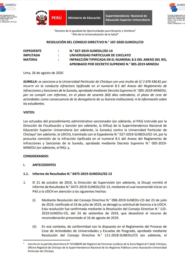 Así lo precisa la Resolución del Consejo Directivo n.107-2020-SUNEDU/CD, firmada por el presidente de ese organismo, Oswaldo Delfín Zegarra Rojas.