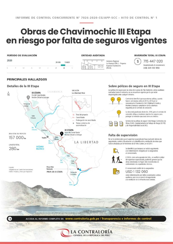 La Contraloría General alertó que la construcción de la presa Palo Redondo y las obras auxiliares ejecutadas hasta el momento en el marco del Proyecto Chavimochic III Etapa, en la región La Libertad, no tienen pólizas de seguro vigentes a la fecha, por lo que se encuentran desprotegidas ante la ocurrencia de siniestros. La inversión asciende a US$ 715 447 020.00 y hasta el momento se ha desembolsado al concesionario US$ 226 100 958.91.