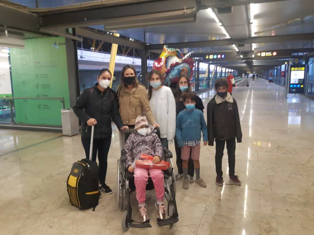 La niña chiclayana Gloria María Limo Vásquez, quien padece de cáncer, llegó esta media noche de Perú a España, en un vuelo humanitario acompañada de su madre, Maeli Vásquez y de otros niños que seguirán similar tratamiento y que se hicieron esta foto a su arribo al aeropuerto de Madrid.