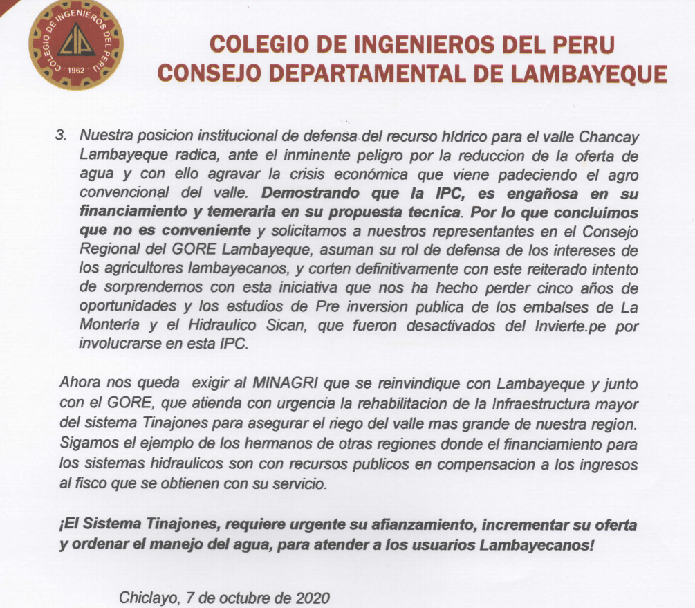 A la vez, solicitaron a sus representantes en el Consejo Regional del GORE Lambayeque, «asuman su rol de defensa de los intereses de los agricultores lambayecanos y corten definitivamente con este reiterado intento de sorprendernos con esta iniciativa que nos ha hecho perder cinco años de oportunidades y los estudios de Preinversión pública de los embalses de La Montería y el Hidráulico Sicán, que fueron desactivados del Invierte.pe por involucrarse en esta IPC».