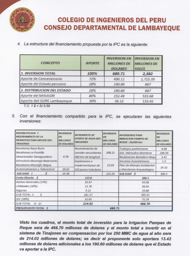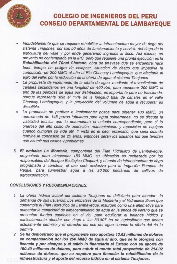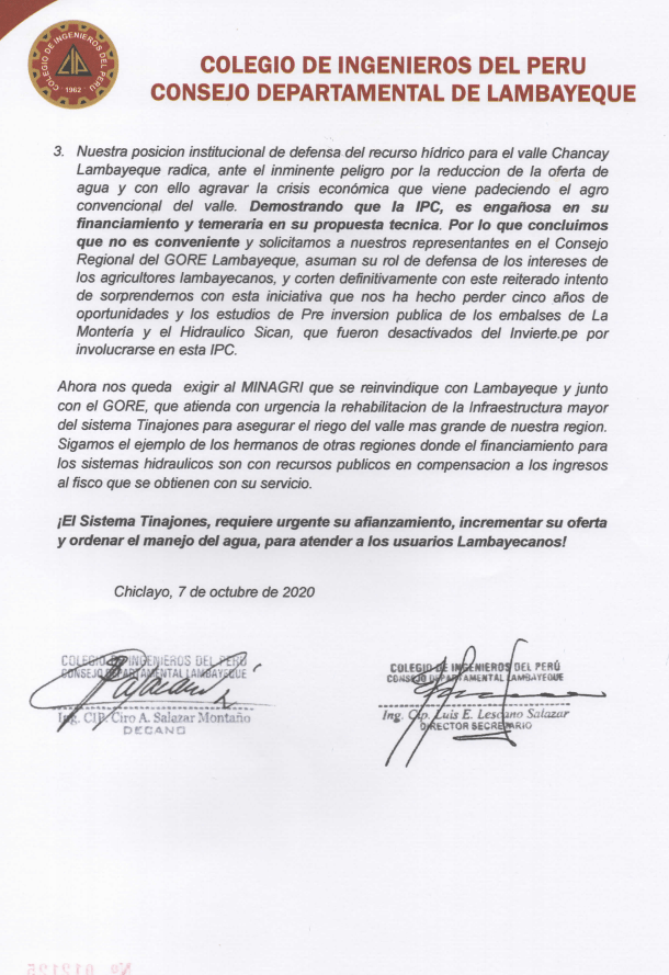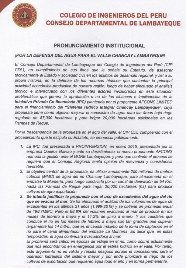El documento técnico es firmado por el decano del CIP, ingeniero Ciro Salazar Montaño y el director secretario, ingeniero Luis Lescano Salazar y se emite “luego de haber efectuado el análisis técnico e interactuado con los diferentes sectores involucrados en esta situación problemática que genera la aprobación o no de los alcances e implicancias de la Iniciativa Privada Cofinanciada-IPC, planteada por Afcons Limited, para el financiamiento del ‘Sistema Hídrico Integral Chancay Lambayeque’. Esta propuesta tiene como objetivo mejorar el suministro de agua para las áreas bajo riego regulado de 87,000 hectáreas e irrigar 20,000 hectáreas adicionales en las Pampas de Reque.
