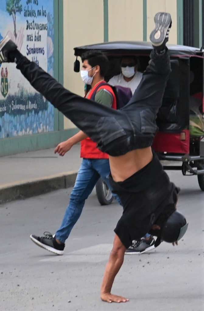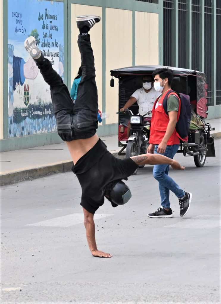 Markos es un venezolano que todos los días, en las esquinas de Sáenz Peña y Leguía, con mucha habilidad hace equilibrio y demuestra que para llevarse un pan a la boca hay que trabajar.