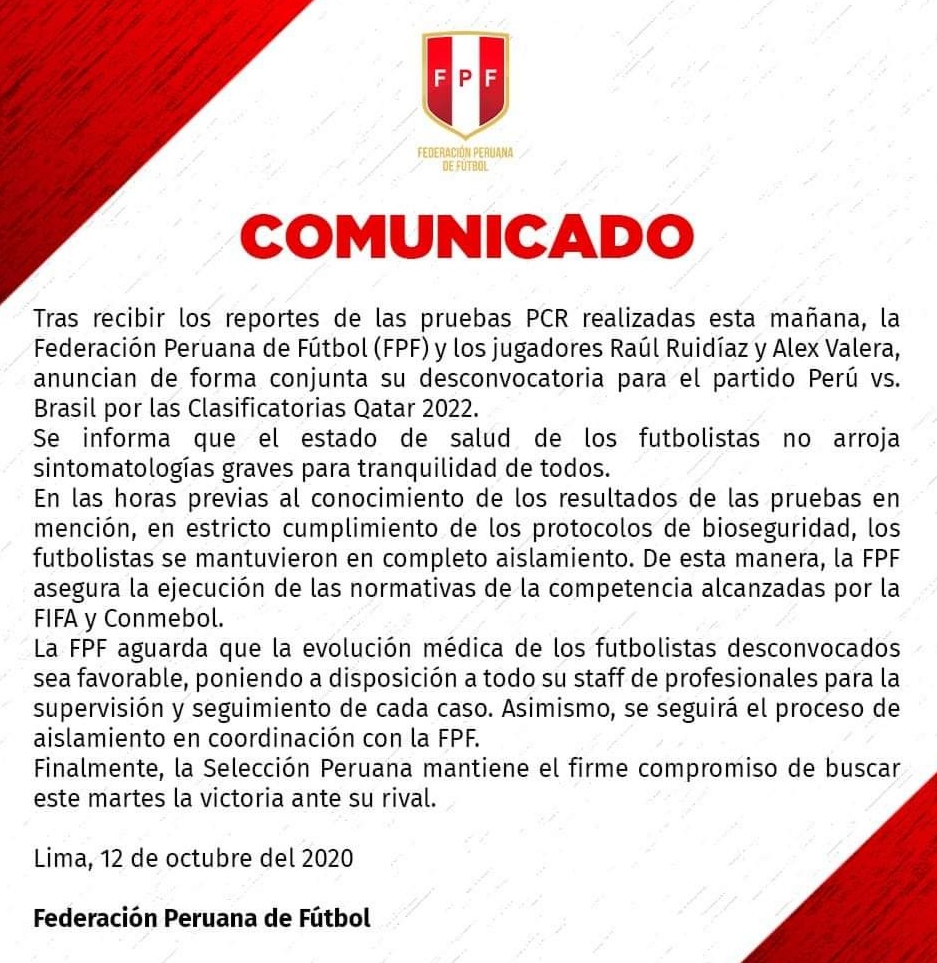 La Selección Peruana indicó que dos futbolistas del plantel dieron positivo a las pruebas de descarte al coronavirus previo al partido ante Brasil.