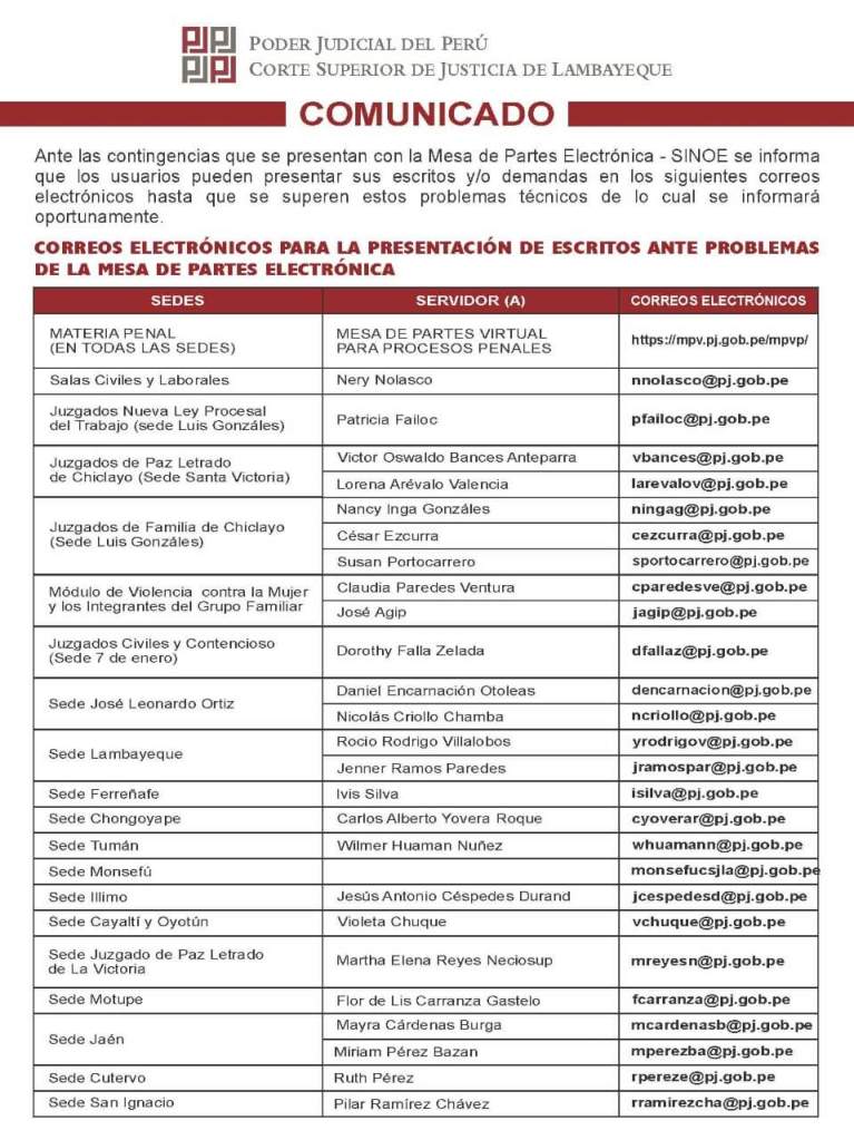 La Corte Superior de Justicia de Lambayeque reportó hoy algunas fallas en la Mesa de Partes Electrónica – SINOE, en las que se registran los expedientes y su procesamiento. Por ello, se informa que ante estas contingencias, los usuarios pueden presentar sus escritos y/o demandas en los siguientes correos electrónicos hasta que se superen estos problemas técnicos de lo cual se informará oportunamente.