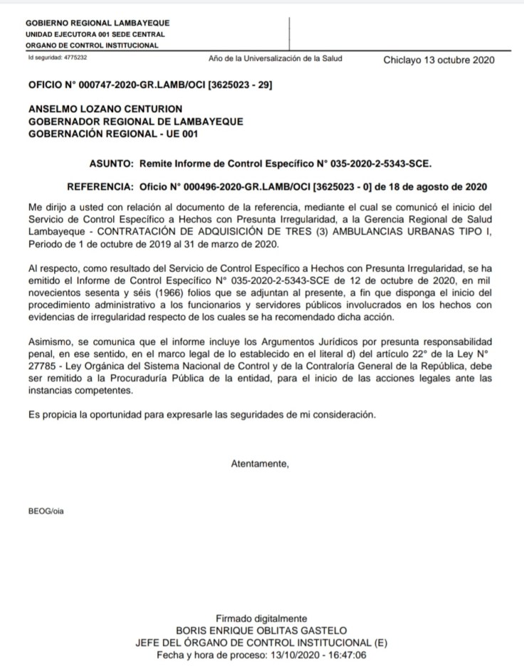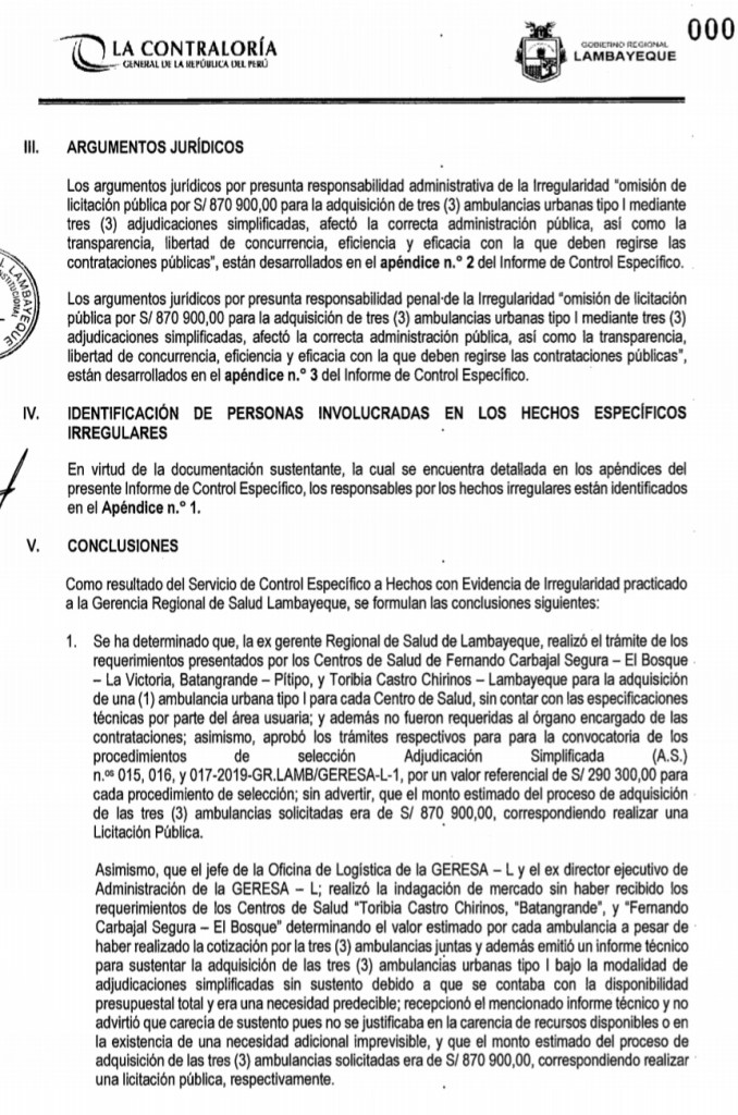 La Contraloría encontró presunta responsabilidad penal en la contratación de tres ambulancias, realizado por la Gerencia Regional de Lambayeque por cerca de 900 mil soles para los centros de salud El Bosque, de La Victoria; Batangrande, Pítipo, en Ferreñafe y Toribia Castro, de Lambayeque. Así se da cuenta en un amplio informe de estas supuestas irregularidades, remitido al gobernador regional.