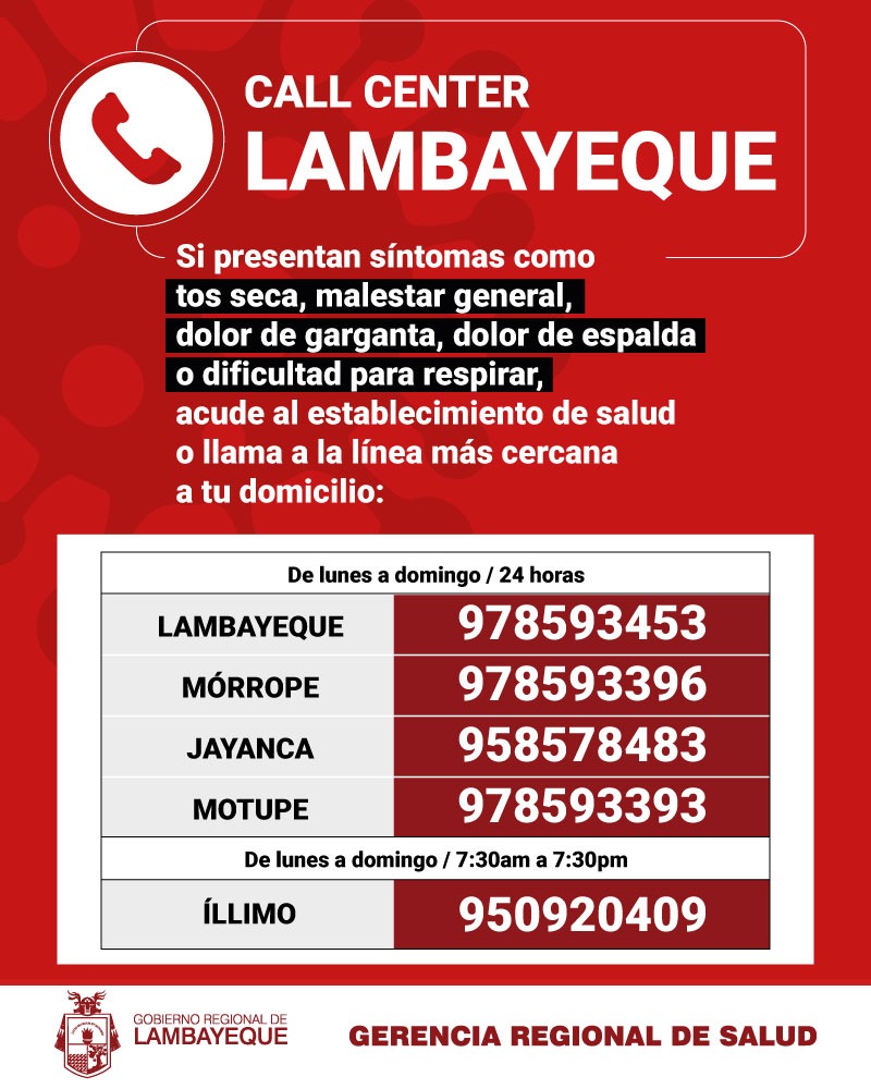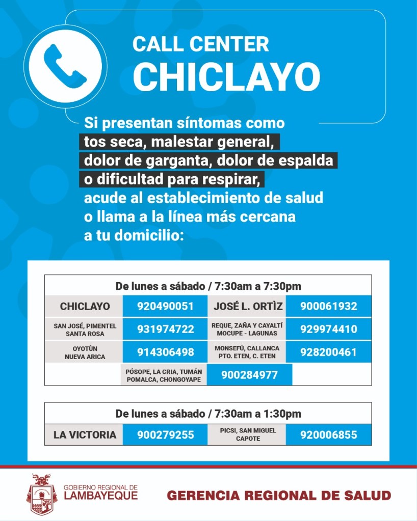 La Gerencia Regional de Salud Lambayeque, actualizó los números del Call Center para la atención de personas con síntomas de la COVID-19 en toda la región Lambayeque. La disposición, se debe al reinicio de las labores presenciales en los establecimientos de salud, a donde la población también puede acudir si presenta síntomas de la enfermedad. Los nuevos números se dan más abajo en este post.