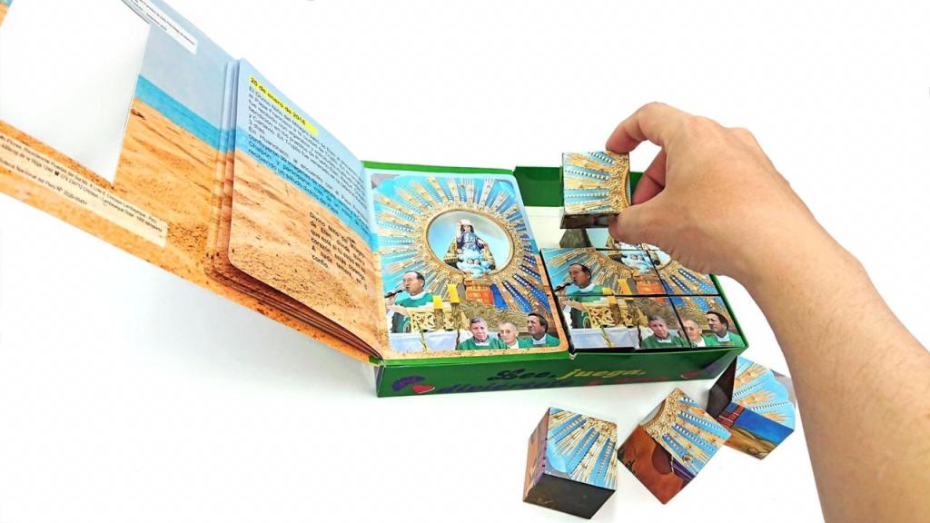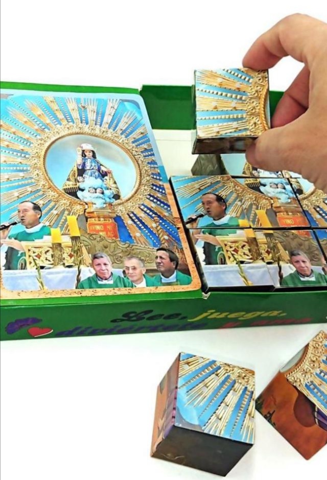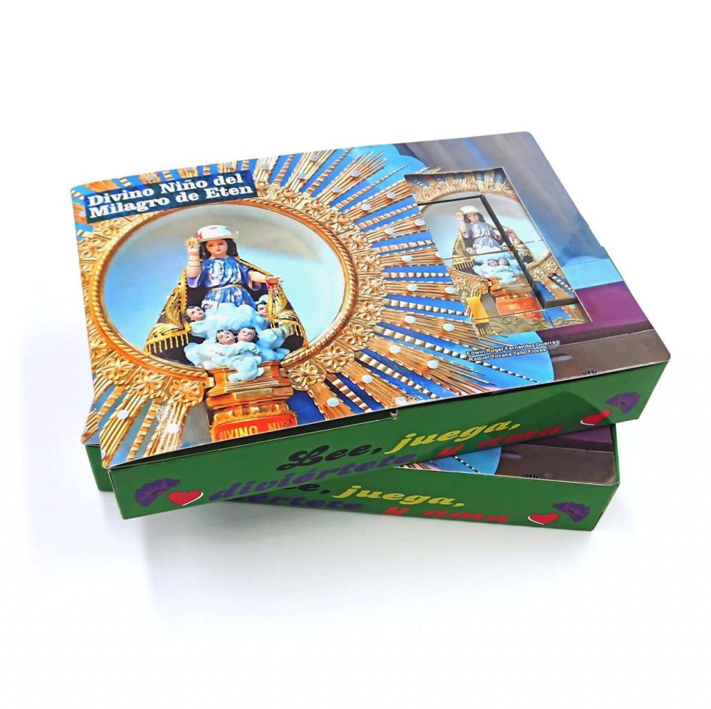 Bajo el lema “Lee, diviértete, conoce y renueva tu fe en Cristo” ya se encuentra disponible el libro lúdico que contiene la historia del Divino Niño del Milagro Eucarístico de Ciudad Eten, sus apariciones, milagros y su encuentro con el Papa Francisco en Trujillo. Son 12 cubos puzzle para que en familia se puedan armar hasta 6 rompecabezas.