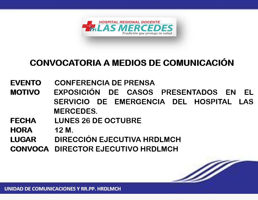 La Dirección Ejecutiva del Hospital Las Mercedes de Chiclayo, del sector Salud, ha convocado al periodismo con el fin de exponer los casos presentados en el Servicio de Emergencia de ese nosocomio. En la invitación a la prensa no se dio a conocer exactamente a qué tipo de casos se refieren. La cita será este lunes 26 al mediodía en la sede de ese establecimiento hospitalario.