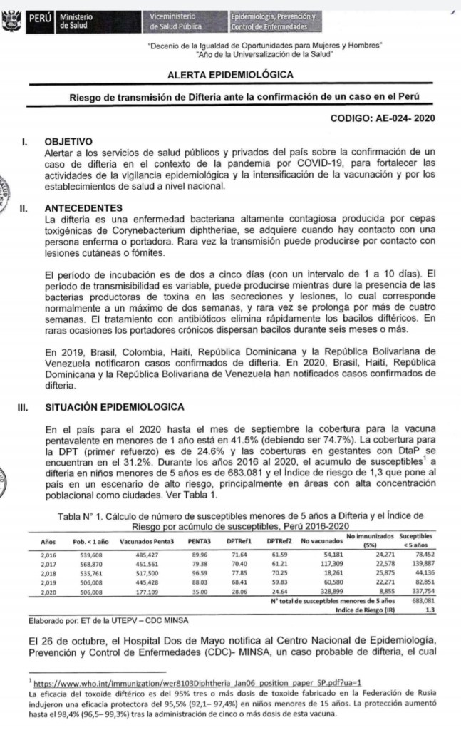 Precisó que la pequeña solamente había recibido su vacuna de nacimiento, es decir, se trata de una niña no vacunada. El último caso confirmado de difteria en el Perú se reportó en el 2000 y en el 2013 hubo uno sospechoso.