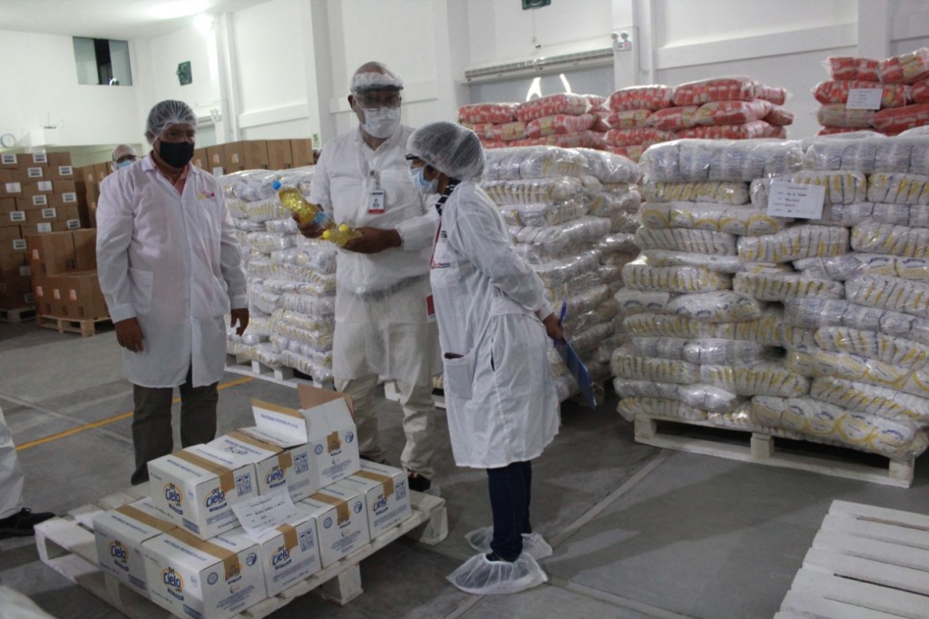 Los alimentos que conforman la entrega comprenden arroz, azúcar, aceite, conserva de pescado, leche evaporada entera, hojuelas de avena con quinua y mezcla en base a huevo.