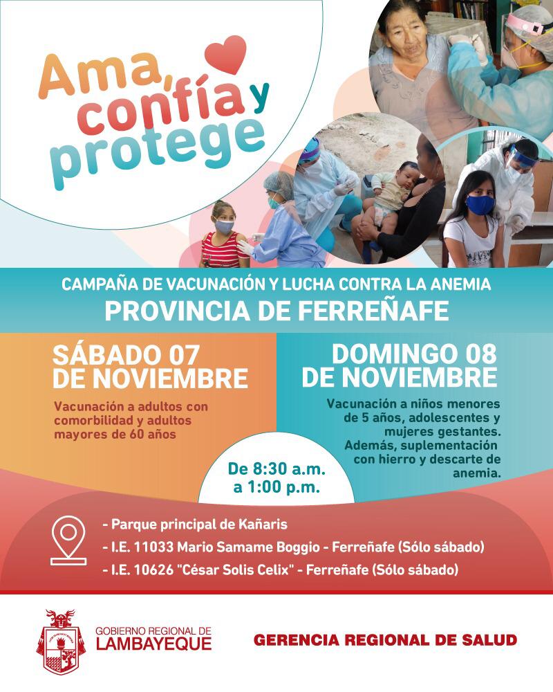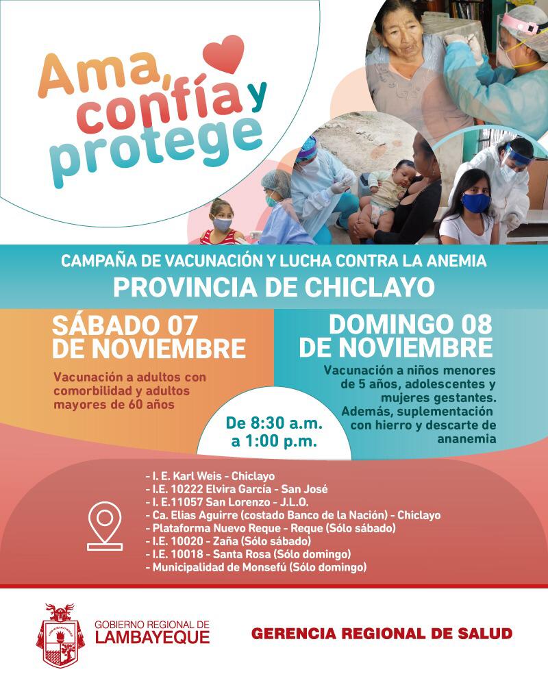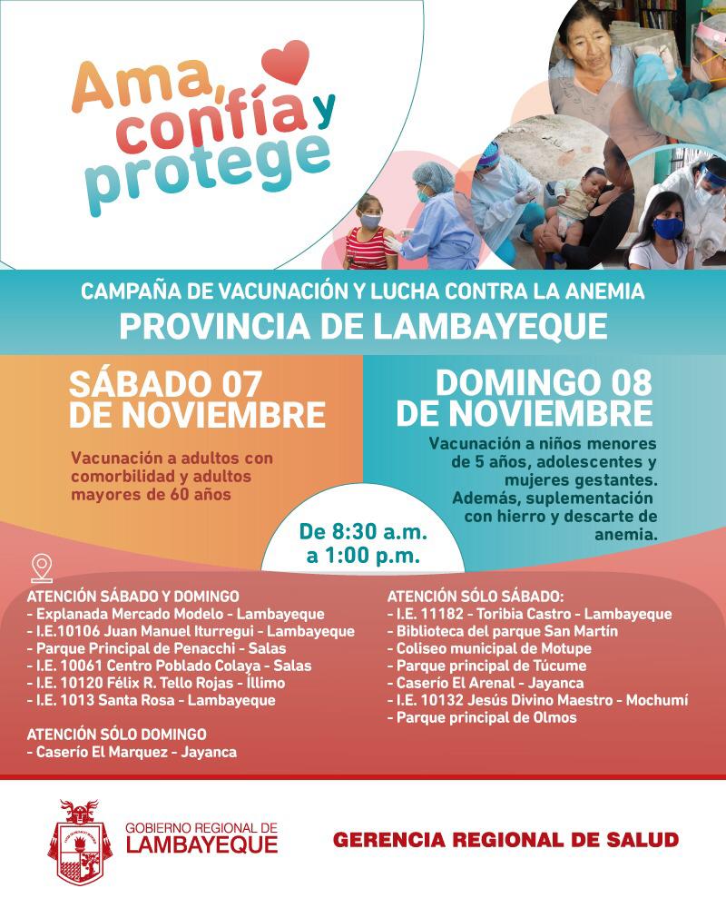 El Gerente Regional de Salud Lambayeque, Dr. Víctor Echeandía Arellano, informó que las fechas y puntos de vacunación ya se encuentran en el página web y redes sociales de la Geresa y gobiernos locales (las damos a conocer en este post). Son 17 vacunas que protegen de 26 enfermedades como la difteria, tétano, tos ferina, influenza, neumococo, entre otras.