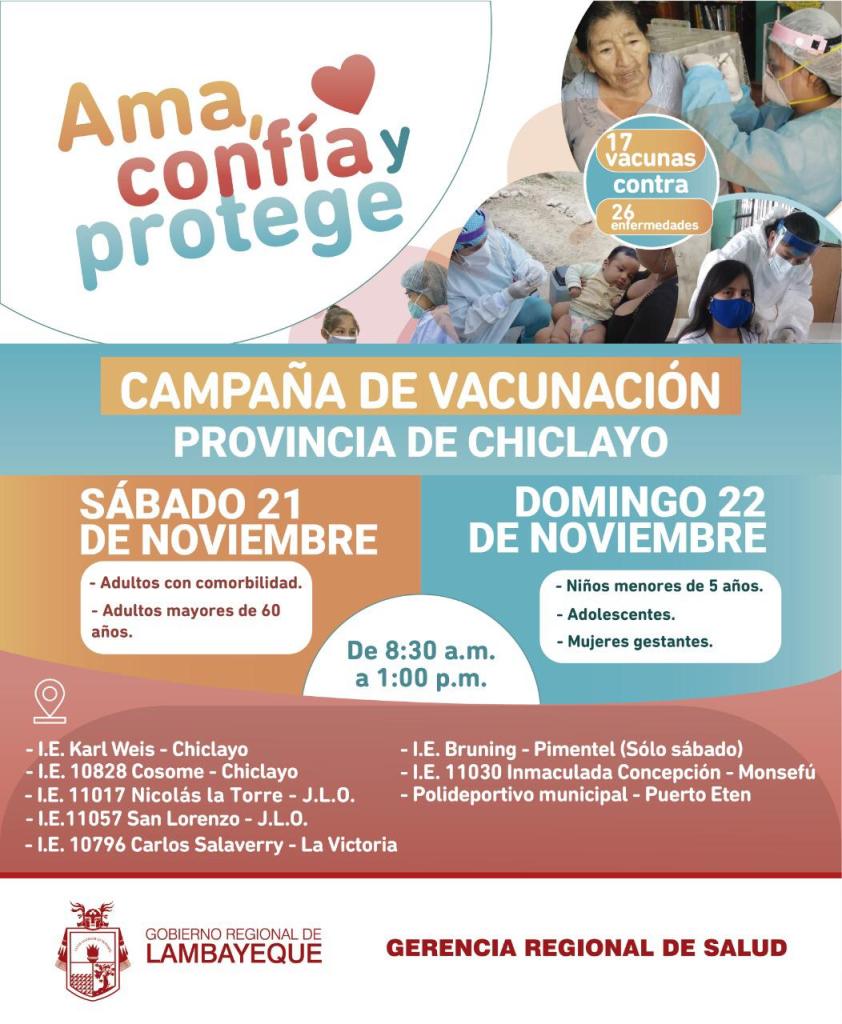 La Gerencia de Salud de Lambayeque b informó que este fin de semana, continúa la campaña de vacunación en las provincias de Chiclayo, Ferreñafe y Lambayeque. Recordó que el sábado se atiende a personas adultas con comorbilidad y adultos mayores de 60 años, mientras que el domingo a los niños menores de 5 años, adolescentes y mujeres gestantes.