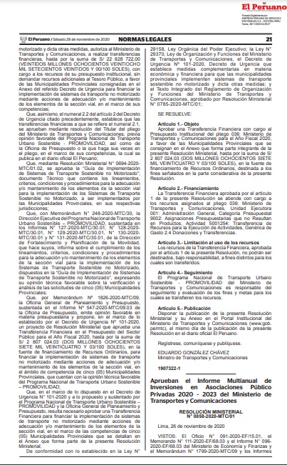 La resolución está firmada por el ministro de Transportes y Comunicaciones, Eduardo Gonzáles Chávez y cuenta con el informe favorable del Ministerio de Economía y Finanzas.