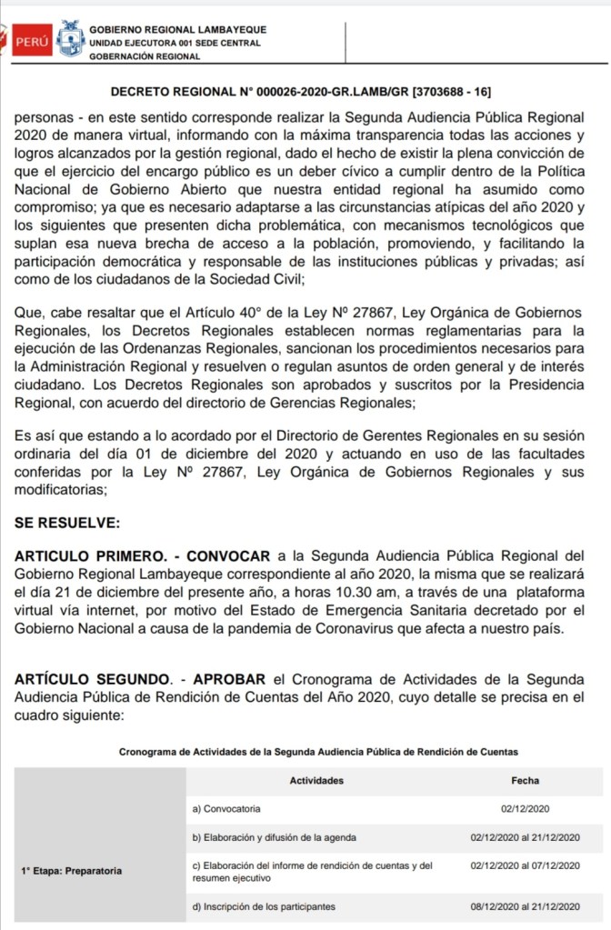 El Gobierno Regional de Lambayeque convocó para el próximo 21 de diciembre a la Segunda Audiencia Pública Regional de Rendición de Cuentas correspondiente al año 2020, cumpliendo con lo estipulado en la Ley Orgánica de Gobiernos Regionales.L a exposición del Gobernador Regional de Lambayeque está programada para las 10.30 de la mañana, a través de plataforma virtual.