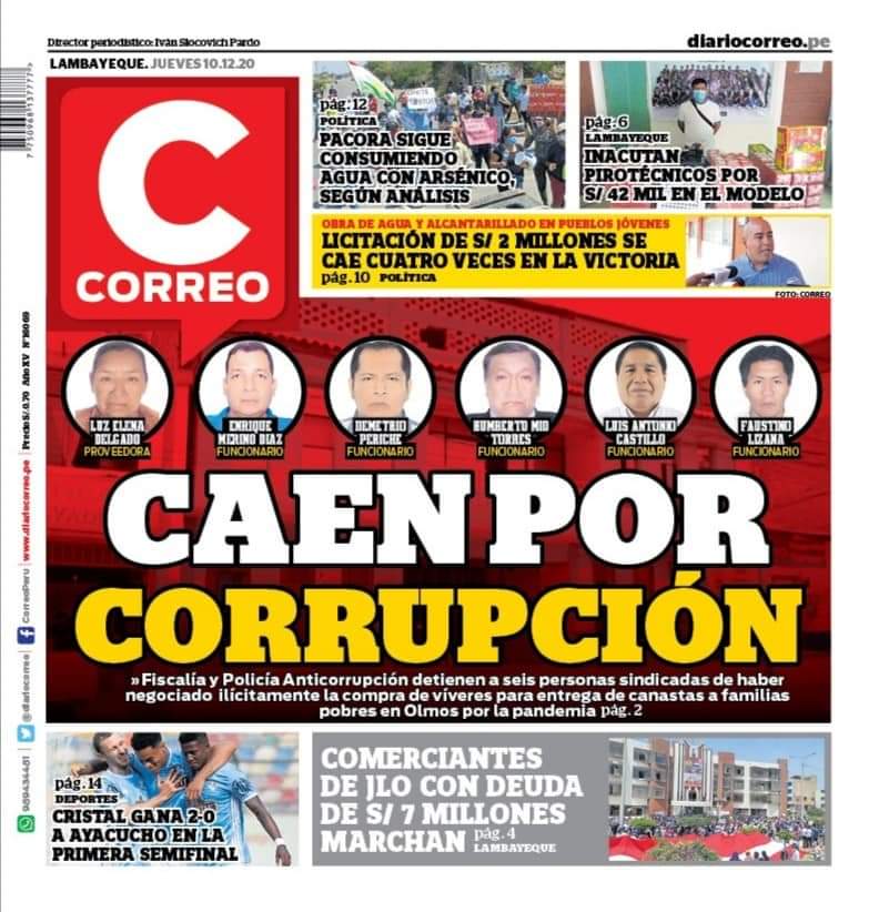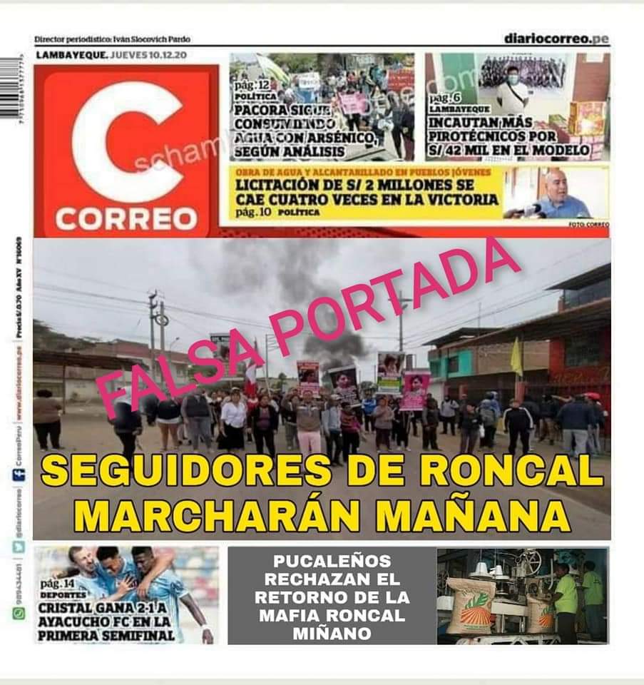El director del diario Correo en Chiclayo, Walter Serquén, denunció una portada falsa del periódico supuestamente de hoy, que viene circulando en las redes. «Comparto la portada original de Correo Lambayeque de hoy 10/12/2020. También agrego foto de una portada falsa que viene circulando en las redes sociales», dijo en su cuenta de Facebook.