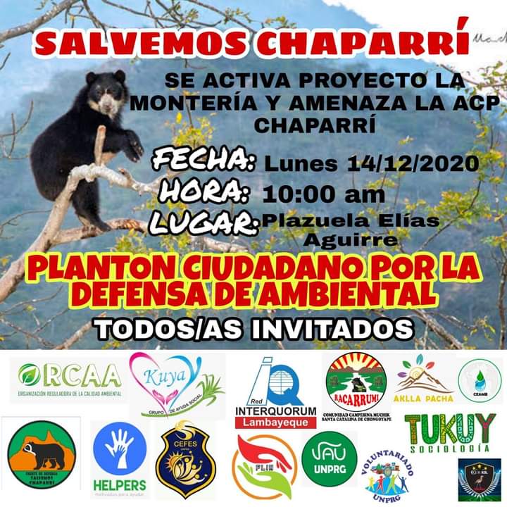 Con el lema «Salvemos Chaparrí», diversas instituciones regionales que tienen que ver con la defensa de la ecología y el medio ambiente, vienen convocando para este lunes 14 a un Plantón Ciudadano por la defensa ambiental. Será a partir de las 10:00 de la mañana en la plazuela Elías Aguirre de Chiclayo.