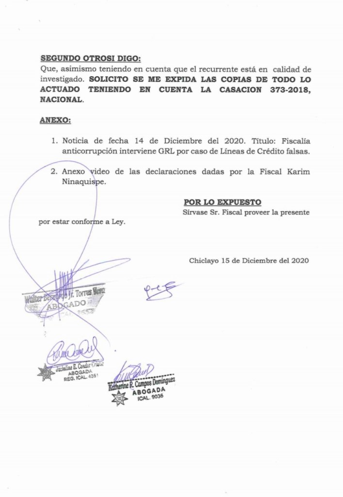 La autoridad regional presentó un escrito ante la fiscal Karim Ninaquispe en la Carpeta Fiscal N°218-2020 dando a conocer los nombres de sus abogados que se harán cargo de su defensa, así como solicitando copias de todo lo actuado a la fecha.