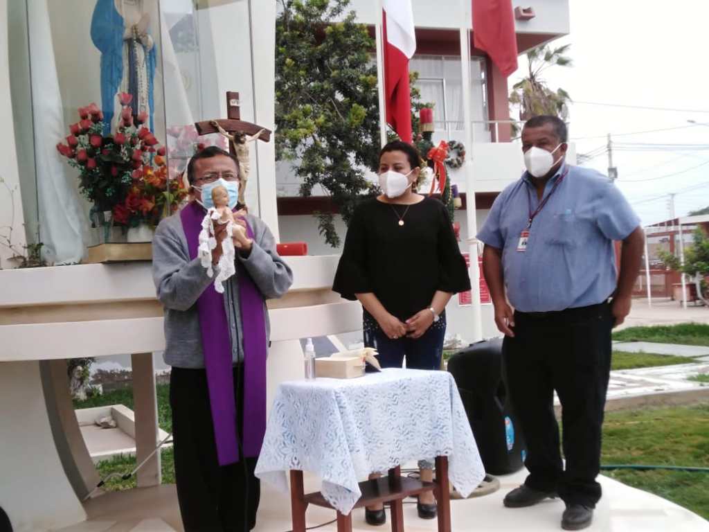 El personal se congregó en el patio central para escuchar la Liturgia de la Palabra a cargo del padre Juan Samamé Niño. El acto fue acompañado con cánticos y oraciones.