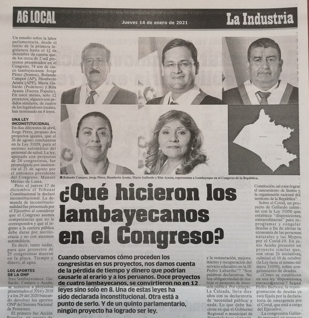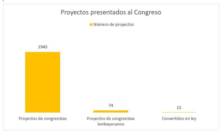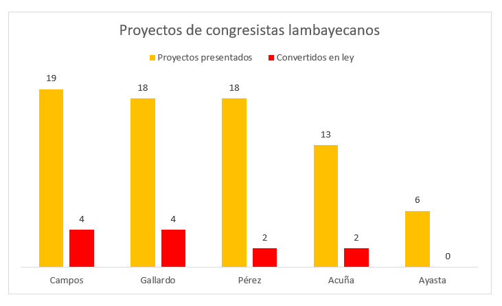 Un estudio sobre la labor parlamentaria, desde el inicio de la primera legislatura hasta el 12 de diciembre último da cuenta que, de los cerca de 2 mil proyectos presentados en el Congreso, 74 son de cinco lambayecanos: Jorge Pérez (Somos), Rolando Campos (AP), Humberto Acuña (APP), María Gallardo (Podemos) y Rita Ayasta (Fuerza Popular). En once meses, solo 12 proyectos, algunos con pedidos similares, de cuatro de los legisladores locales, han terminado en 8 leyes.