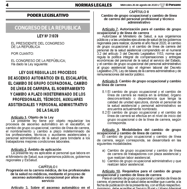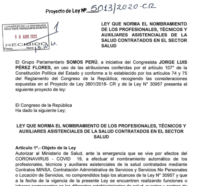 En días diferentes de abril, el congresista por Lambayeque, Jorge Pérez, propuso dos proyectos iguales, que el 26 de agosto concluyeron en la Ley 31039, para el ascenso automático del personal de salud. La ley, apoyada con proyectos de otros 24 congresistas, fue promulgada por insistencia el 21 de agosto por el entonces presidente del Congreso, Manuel Merino de Lama.