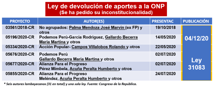 Tres lambayecanos: Gallardo, Campos y Acuña, se sumaron a la avalancha de dos proyectos presentados el 2016 y 2018 y a los 29 que, sobre lo mismo, se registraron todo el 2020 buscando devolver los aportes ONP, del Sistema Nacional de Pensiones.