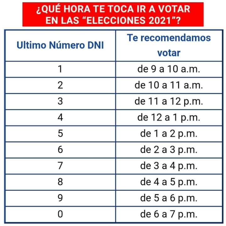 ONPE, ya publicó el horario para ir a votar en las elecciones 2021, de acuerdo al último número de tu DNI. Las Elecciones Generales 2021, se realizan en 11 de abril, en donde se elegirá, al Presidente de la República, Vicepresidentes, así como a Congresistas de la República y representantes peruanos ante el Parlamento Andino.