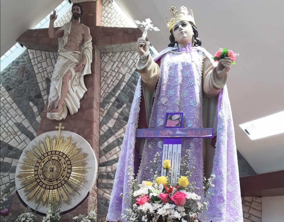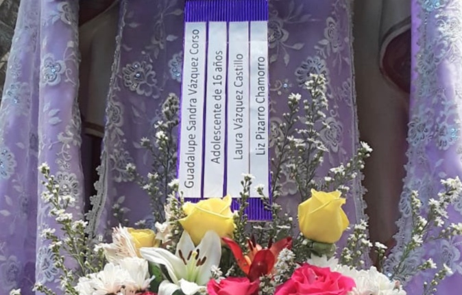 En el templo de Ciudad Eten, en el parque principal del lugar, la imagen de Santa María Magdalena lucía con los nombres de las 4 víctimas de feminicidio en el Perú.