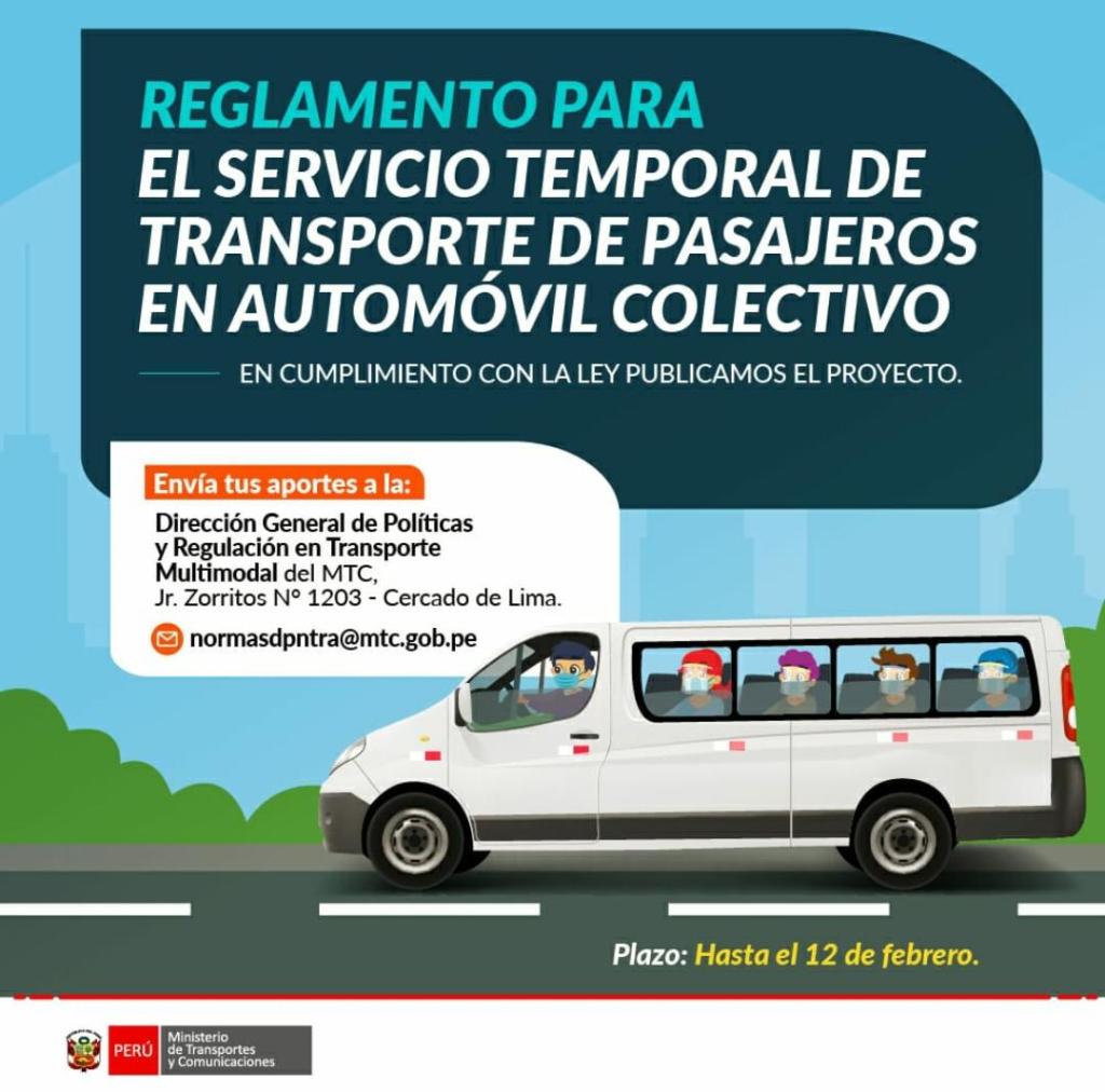 En estricto cumplimiento a lo dispuesto en la Ley N° 31096, el Ministerio de Transportes y Comunicaciones (MTC) publicó el proyecto del Reglamento de dicha norma que establece la formalización del transporte terrestre de pasajeros en auto colectivo, la cual fue aprobada por el Congreso de la República y es aplicable en todo el territorio nacional, con exclusión de Lima y Callao.