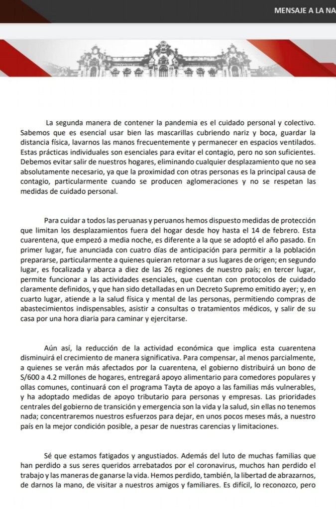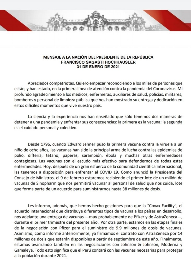En un mensaje a la Nación difundido está mañana al inicio de la cuarentena en diversas regiones del país, el presidente de la República, Francisco Sagasti, ratificó lo dicho en la víspera por la titular de la Presidencia del Consejo de Ministros, Violeta Bermúdez, en el sentido que la vacuna estará llegando al Perú el próximo 9 de febrero.