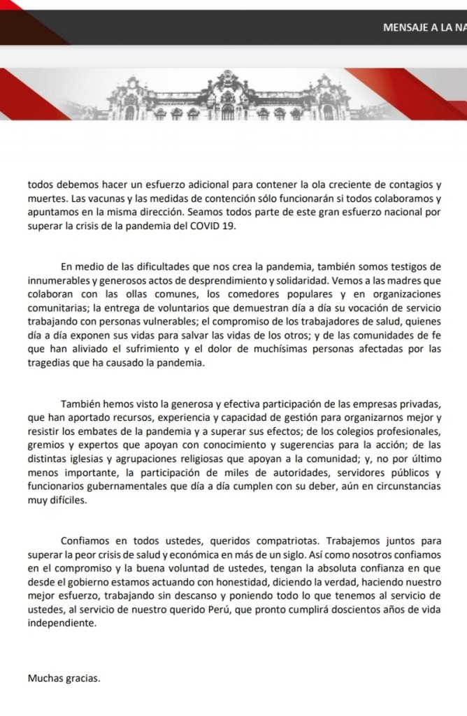 Asimismo, el jefe de Estado pidió a todos los peruanos trabajar juntos «para superar la peor crisis de salud y económica en más de un siglo».