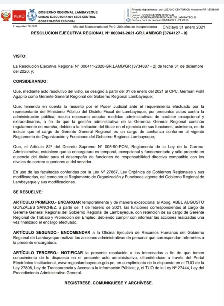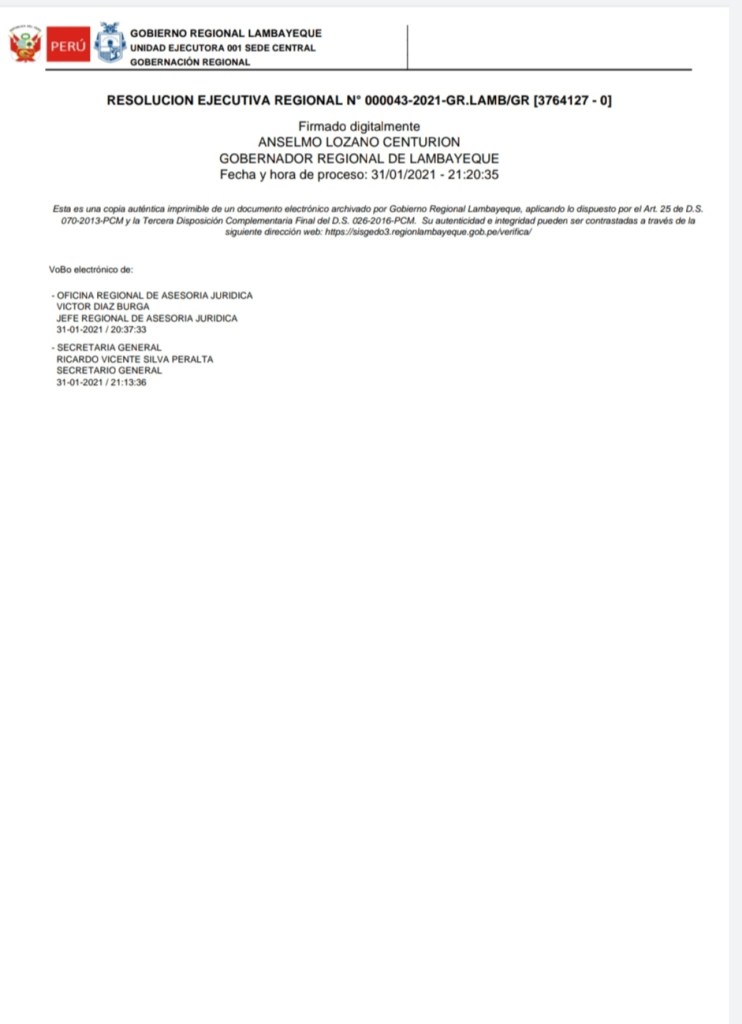 La resolución n.° 043 fue rubricada por el gobernador regional de Lambayeque, Anselmo Lozano Centurión, luego de las coordinaciones realizadas por la Procuraduría Pública ante el juez y el fiscal, considerando que pese a las medidas restrictivas dictaminadas en su contra, legalmente no está impedido de firmar documentos y al no tener reemplazo porque el vicegobernador también fue incluido en las investigaciones preliminares, está dentro de sus facultades emitir los actos resolutivos en cumplimiento de su función.