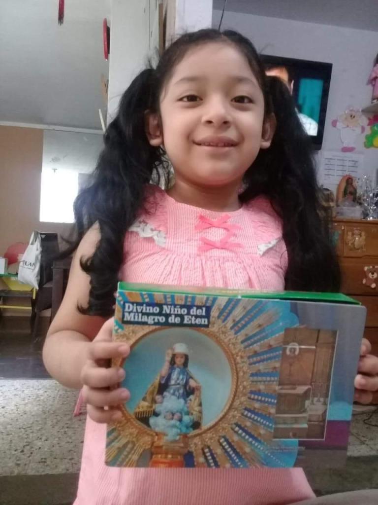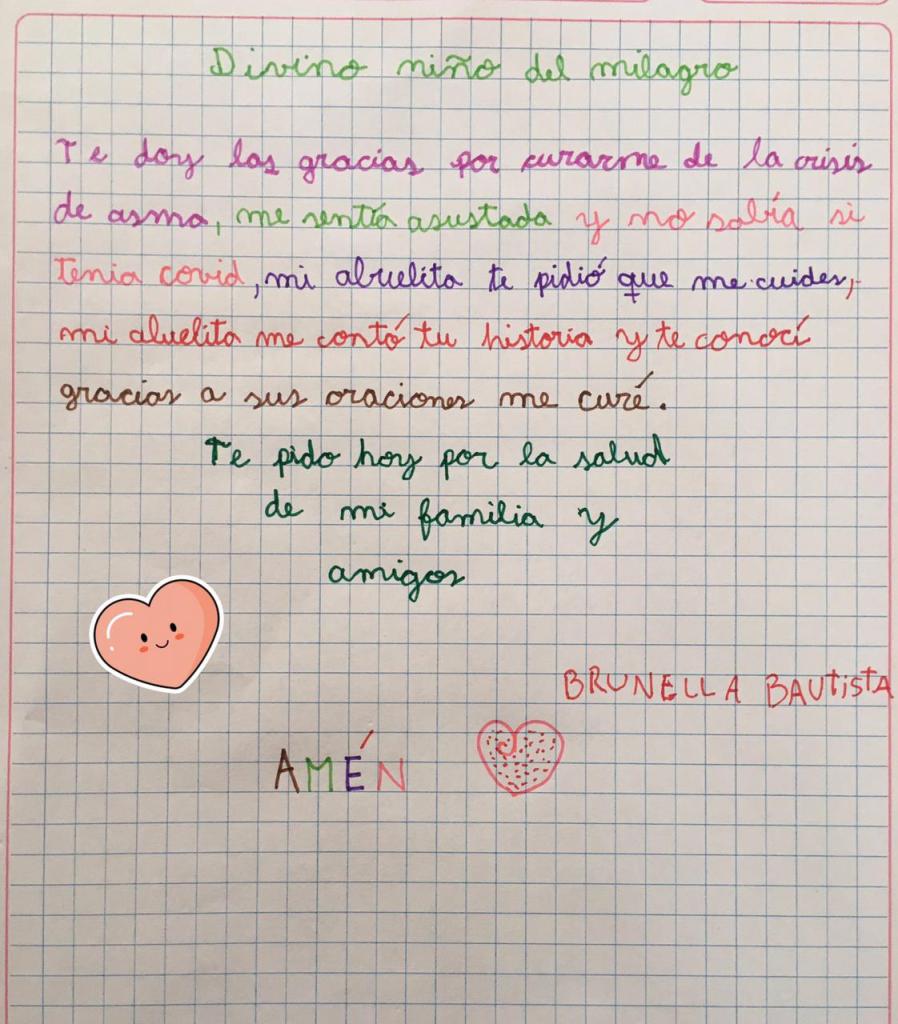 La pequeña Brunella Bautista escribió en su cuaderno una carta con lapiceros de colores y envió la fotografía. La carta dice: “Divino Niño del Milagro, te doy las gracias por curarme de la crisis de asma; me sentía asustada y no sabía si tenía Covid; mi abuelita te pidió que me cuides, me contó tu historia y te conocí; gracias a sus oraciones me curé. Te pido hoy por la salud de mi familia y mis amigos. Amén”.