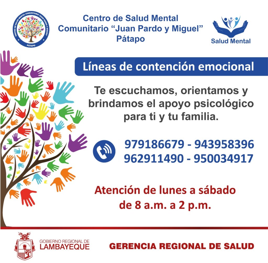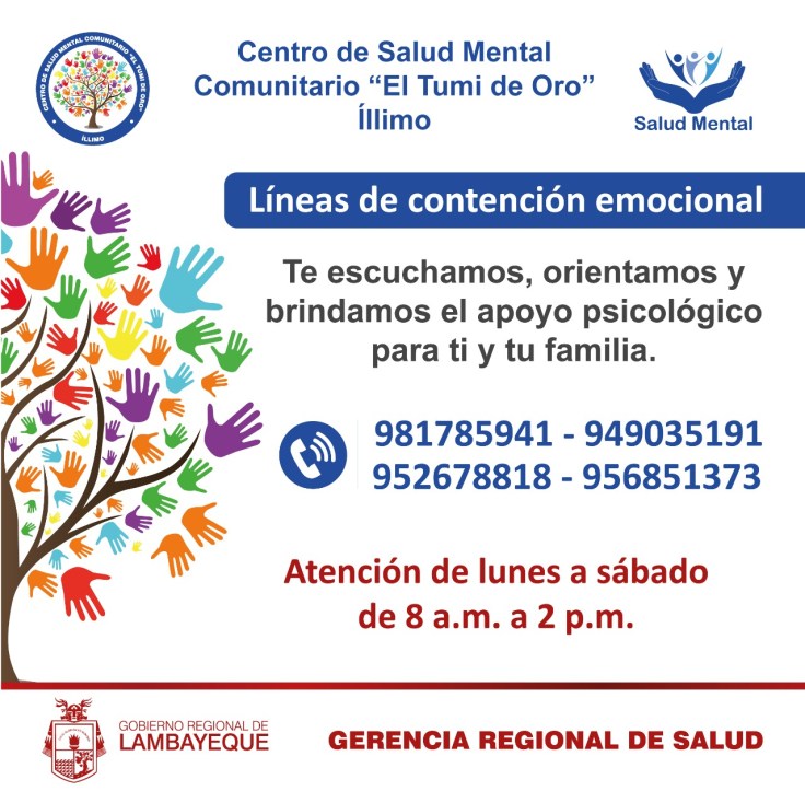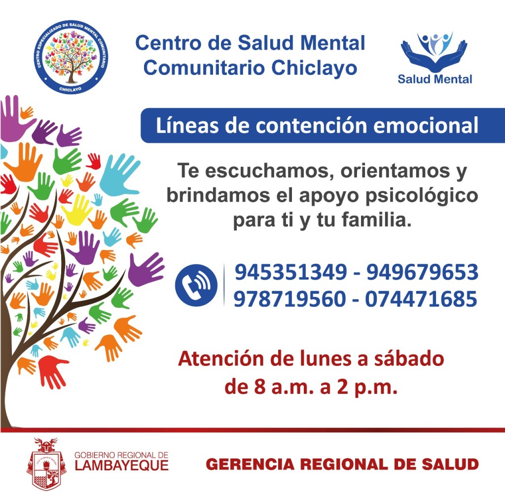 Con el objetivo de seguir velando por la salud mental de las familias lambayecanas afectadas por la pandemia de la COVID-19, la Gerencia Regional de Salud Lambayeque habilita nuevas líneas telefónicas de contención emocional. Profesionales de los cuatro Centros de Salud Mental Comunitarios con los que cuenta la región Lambayeque, atenderán de manera gratuita las llamadas de la población de lunes a sábado en el horario de 8 a.m. a 2 p.m.