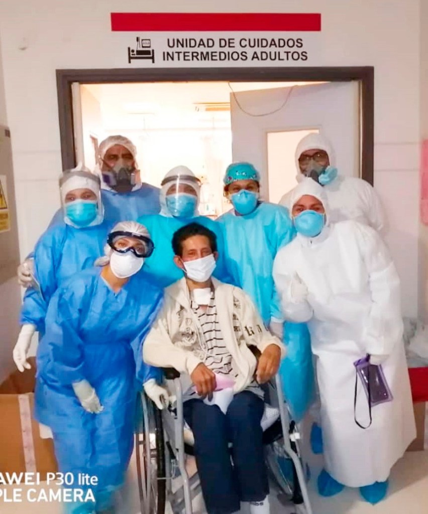 Con alegría el equipo profesional de la Unidad de Cuidados Intensivos del Hospital Regional de Lambayeque despide al paciente CCLA de 51 años de edad. Fue luegi de ser dado de alta, tras permanecer casi 70 días hospitalizado y más de 30 días con ventilador mecánico, presentando un cuadro de desnutrición y a quien se le realizó una traqueotomía.