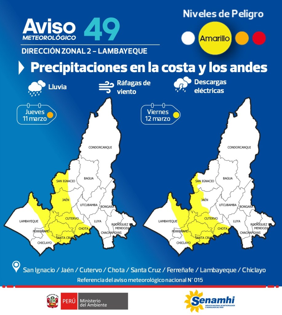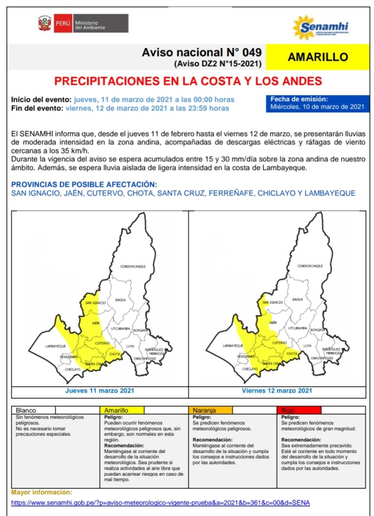Según Senamhi, el riesgo que revisten, considerado con el color amarillo, es que «pueden ocurrir fenómenos meteorológicos peligrosos que, sin embargo, son normales en esta región».