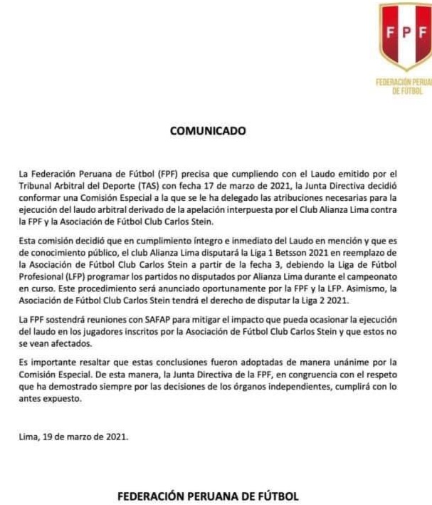 La Federación Peruana de Fútbol decidió hoy que el equipo de Alianza Lima reemplace al del Club Carlos Stein de Chiclayo para jugar en la Liga 1 del fútbol profesional peruano. Así lo dio a conocer en un comunicado en el que se señala que tal medida se adopta cumpliendo con el laudo emitido por el Tribunal Arbitral del Deporte (TAS), ante el reclamo del Alianza.