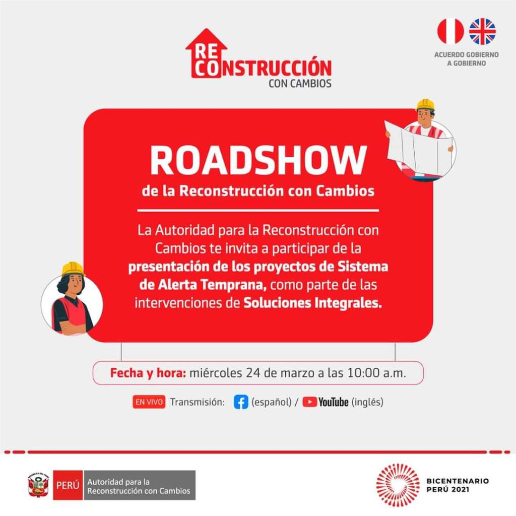 A fin de continuar con la ejecución de proyectos contemplados en el Acuerdo Gobierno a Gobierno firmado por el Perú y el Reino Unido, la Autoridad para la Reconstrucción con Cambios (ARCC) presentará el miércoles 24 de marzo, ante empresas nacionales e internacionales, los proyectos de sistemas de alerta temprana que se implementarán para beneficiar a las regiones de Tumbes, Piura, Lambayeque, La Libertad, Áncash, Lima e Ica.