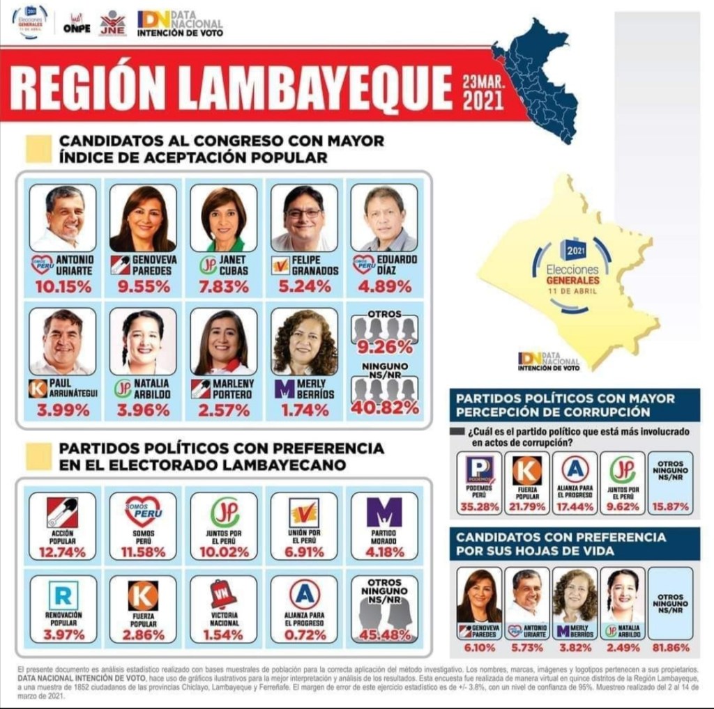 A pesar que una empresa encuestadora identificó a 9 de los candidatos que postulan al Congreso de la República por Lambayeque como los que tienen mayor índice de aceptación popular, un 40% dijo no saber o no responder ante la pregunta por cuál de los postulantes daría su voto.