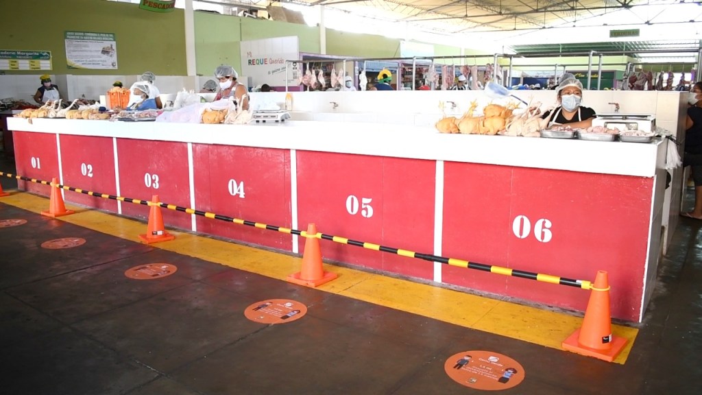 El uso permanente de las mascarillas, la indumentaria con gorros y mandiles para los vendedores, la señalización para el cumplimiento del distanciamiento social, la regulación de manejo de residuos sólidos, la implementación de lavatorios para el lavado de manos y los dispensadores de alcohol en gel, son algunas de las medidas regulatorias que se han implementado en dicho centro de abastos.