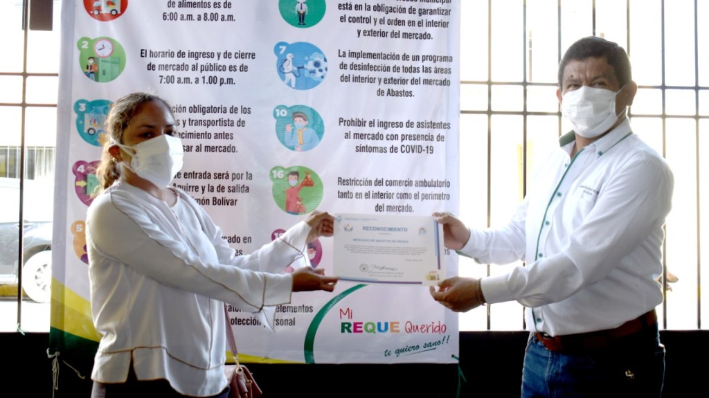 La Gerencia Regional de Salud de Lambayeque en el marco de prevención contra la COVID-19, otorgó el reconocimiento al mercado del distrito de Reque, por la implementación y cumplimiento de las principales medidas obligatorias que regula su funcionamiento como un “mercado saludable”.