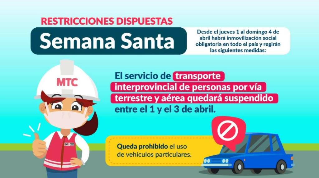 El Ministerio de Transportes y Comunicaciones (MTC) informa que el servicio de transporte interprovincial de personas por vía terrestre y aérea quedará suspendido del 1 al 3 de abril en todo el país, en cumplimiento de las restricciones focalizadas por Semana Santa, dictadas mediante el Decreto Supremo Nº 058-2021-PCM, a fin de evitar el contagio de la Covid-19.
