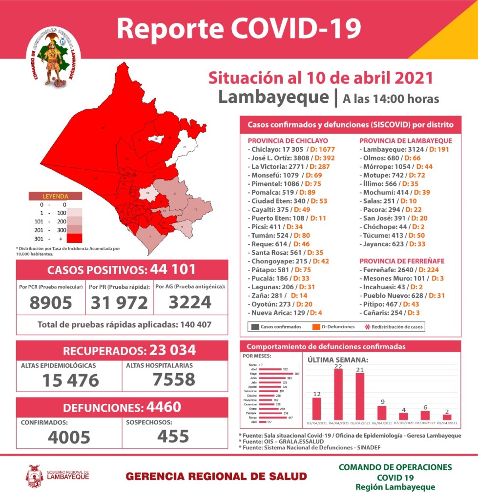 Debido a la actualización de información de defunciones, en Lambayeque los diez primeros días de abril se registraron más muertos que los habidos por el Covid en marzo último: 534 contra 364. En enero hubo 250 fallecidos y en febrero 286. Asimismo, de ayer a hoy se superaron los 44 mil contagiados en esta región.